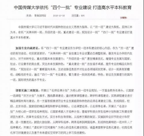 2018年12月,教育部发布《关于批准2018年国家级教学成果奖获奖项目的决定》,由我校高晓虹教授主持的“实践中的马克思主义新闻观”喜获国家级教学成果一等奖,这是我国新闻传播学科教育首次获得国家级教学成果一等奖。同时,由北京师范大学、中国传媒大学、北京电影学院共同申报的成果《跨校联合、校企协同,动漫高端人才培养模式的创新与实践》荣获2018年高等教育国家级教学成果奖二等奖。