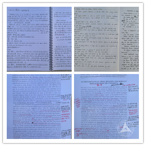 李巧针老师并不是思想政治教育专业出身,在北京师范大学攻读博士学位时,她主要学习和研究的领域是比较高等教育学。正因为如此,“为了赶上我的同事们,我必须要付出百倍的努力。”为了给学生们上好思政课,她可没少下功夫。备课期间她阅读了大量的经典书籍,如《共产党宣言》、《1844年经济学哲学手稿》、《习近平谈治国理政》、《邓小平文选》、《毛泽东传》、《时间简史》、《苦难辉煌》、《理性的繁荣》等等,还有一些教育教学理论与实践方面的著作,如《全球化时代的大学通识教育》、《如何成为卓越的大学教师》、《理解教与学:高校教学策略》等等。当然,光阅读是远远不够的,我们访谈时她还拿出一大摞笔记本,上面密密麻麻地记满了她手写的笔记:有经典语句摘录,有对理论问题的思考,也有对现实问题的看法……“年轻人不喜欢用笔写了,都用电脑打字,我倒觉得用笔做笔记才更方便。”她笑着对我们说,“平时可随写、随记、随看、随用,我很受益。”除此之外,她还会关注中外重大热点问题,并将具有教育意义的问题,运用合适的切入点,在课上与同学们进行交流、讨论。“李老师讲课是理论联系实际,突出时代主旋律,具有时代特点,所以我们特喜欢她的课。”学生们对她的课总是津津乐道。