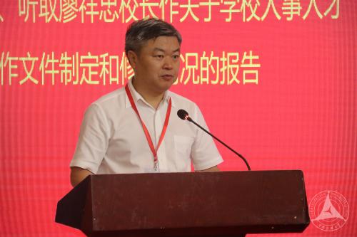廖祥忠校长首先作关于《中国传媒大学人事人才制度改革系列文件(审议稿)》制定和修订的说明。廖校长详细地报告了制定修订人事人才系列文件的背景和过程,制定修订系列文件的主要考虑和制定修订的重点内容。他指出,体制机制和人才队伍是高等教育实现内涵发展的两大关键。2018年学校完成了全面深化学校管理体制机制的改革,实现了组织架构重建、机构职能调整。学校进入大变革大发展的新时代,原有的因顶层设计不足、体制机制落后带来的人事人才积弊问题进一步凸显,已经到了“不改不行,非改不可”的地步。所以,学校党委下定决心向全面深化改革的深水区挺进,对人事人才制度进行系统性改革、结构性重置,打响这场为解决问题积弊采取的集中攻坚战役。