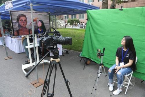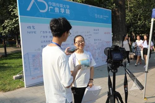新闻学院新增设了学生融媒体新闻作品展示环节,使用8个交互式触摸屏,展示了往届生在数可视及数据新闻大赛中的获奖作品。电视学院则设计了醒目的朋友圈式合影板,和往年相同的是,学院各个专业的展板包括引导流程均用英文标注,报到全程也是使用英语交流。