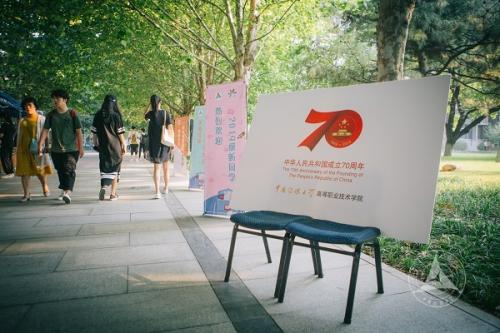 祖国七十周年华诞,许多学院将爱国主义教育与新生报到紧密结合。戏剧影视学院制作了“我和我的祖国”主题展牌,以供2019级新生入学合影留念。经济与管理学院以“喜迎白杨学子,共庆祖国华诞”为主题,设计了和国庆、校庆相关的大喷,同时用印有“我爱中国”和“我爱中传”字样的可爱饰件吸引新生和家长驻足拍照。