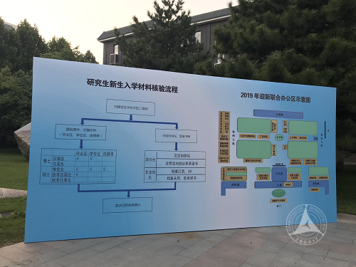 为方便新生办理各项报到和入学手续,研究生院制作了研究生新生入学材料核验流程图和2019年迎新工作联合办公区示意图等各类指示牌,对整个迎新流程和各部门的迎新位置作了清楚的指示。
