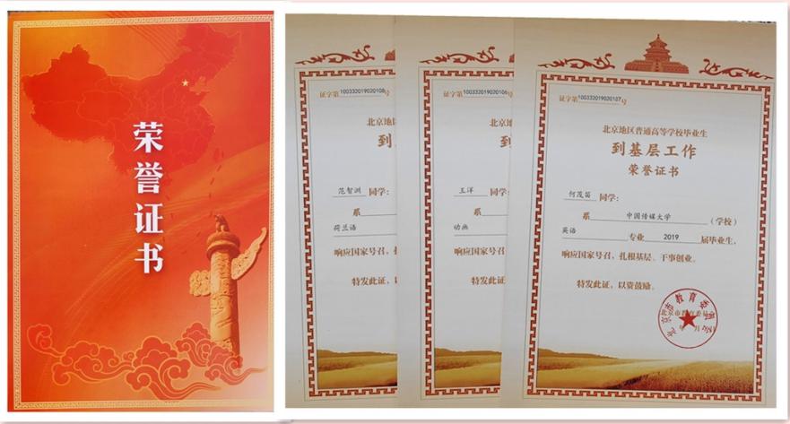 范智洲、王洋、何茂笛同学的到基层服务荣誉证书