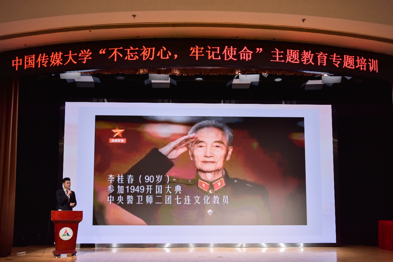 随后,播音主持艺术学院李元豪同学以“我身边的红色故事”为主题向大家讲述了他爷爷的红色故事,并展示了由一名老共产党员、耄耋老人亲笔写下的一首对党的赞歌:“祖国大地日月新,七十春秋追梦人。牢记使命勿懈怠,无私奉献永为民。中华儿女跟党走,心歌一路砥砺进。”老人一生坚守初心使命的壮举,令师生党员深受感动。
