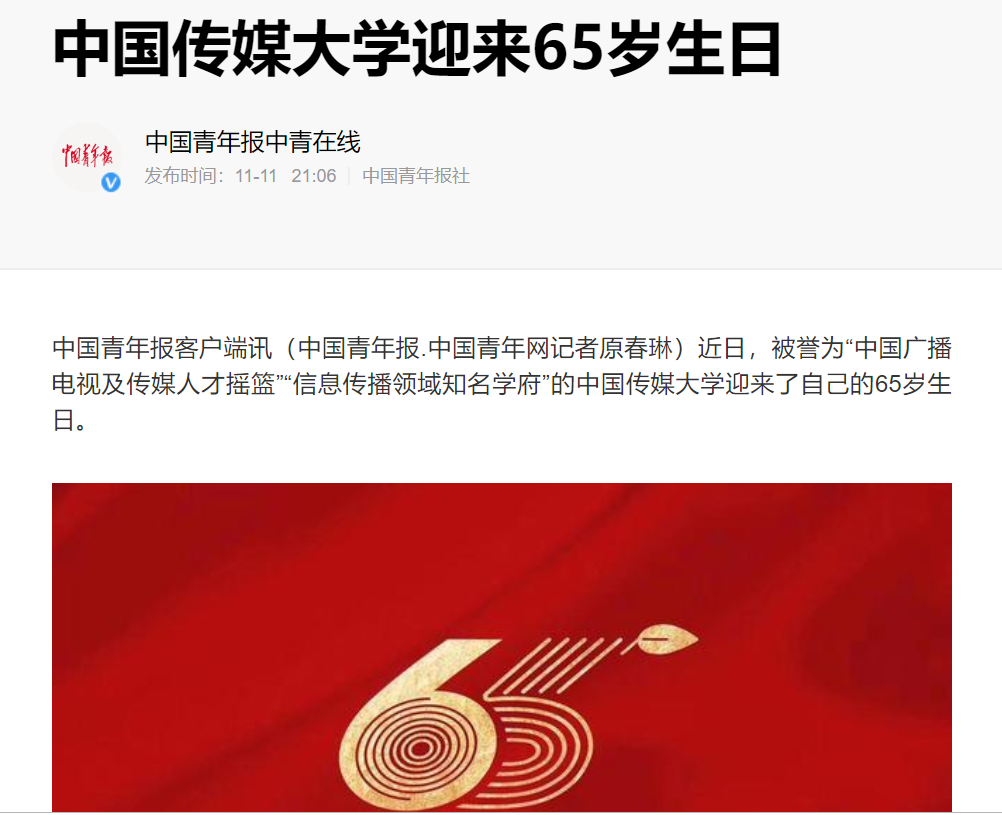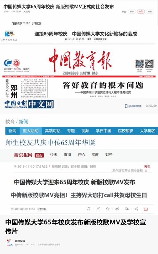 “新版校歌MV发布”微信单条推文阅读量突破50万,微博话题#中国传媒大学65周年校庆#参与度接近1900万,新版宣传片微信推送单条阅读量接近3万,《中国教育报》头版头条大篇幅报道学校,新华社、中央人民广播电台、中央电视台、中国教育报、北京电视台等20多家主流社会媒体加入报道阵营,网络媒体竞相转载。11月10日的中国传媒大学校庆日活动,成为校内外媒体共同瞩目的焦点。