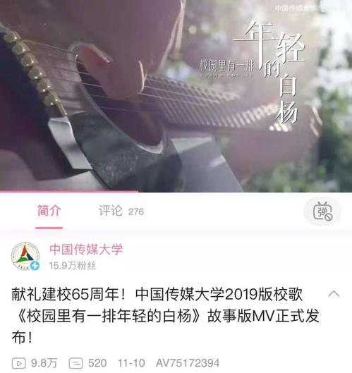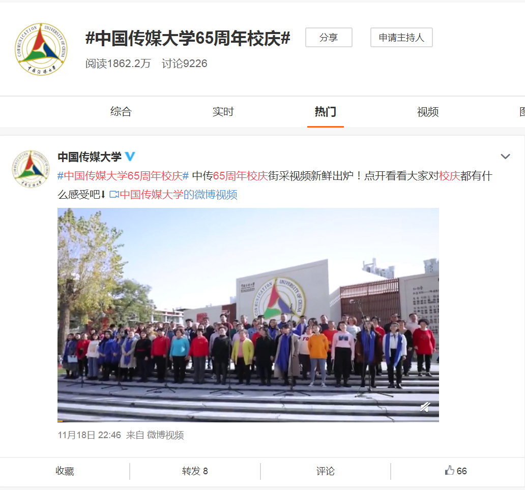 从10月24日起,校庆宣传进入密集期,官微先后推出校庆相关推文17篇,包括校庆公告、校庆标识、校庆头像框、新版校歌MV、学校宣传片,中传文化广场揭幕仪式,留学生表白母校,对校庆活动日主要活动的多角度展示,校友对母校的祝福等信息。每一篇推文都得到了师生、校友、媒体的广泛关注,大家纷纷留言、点赞、转发。据统计,17篇校庆推文总阅读量超过88万,点赞数超过1万,留言接近2000条。其中,《年轻的白杨|中国传媒大学新版校歌MV隆重发布》推出后,立即引发刷屏狂潮,2小时内阅读量突破10万,5小时内阅读量突破20万,此后连创新高,总阅读量已超过50万。