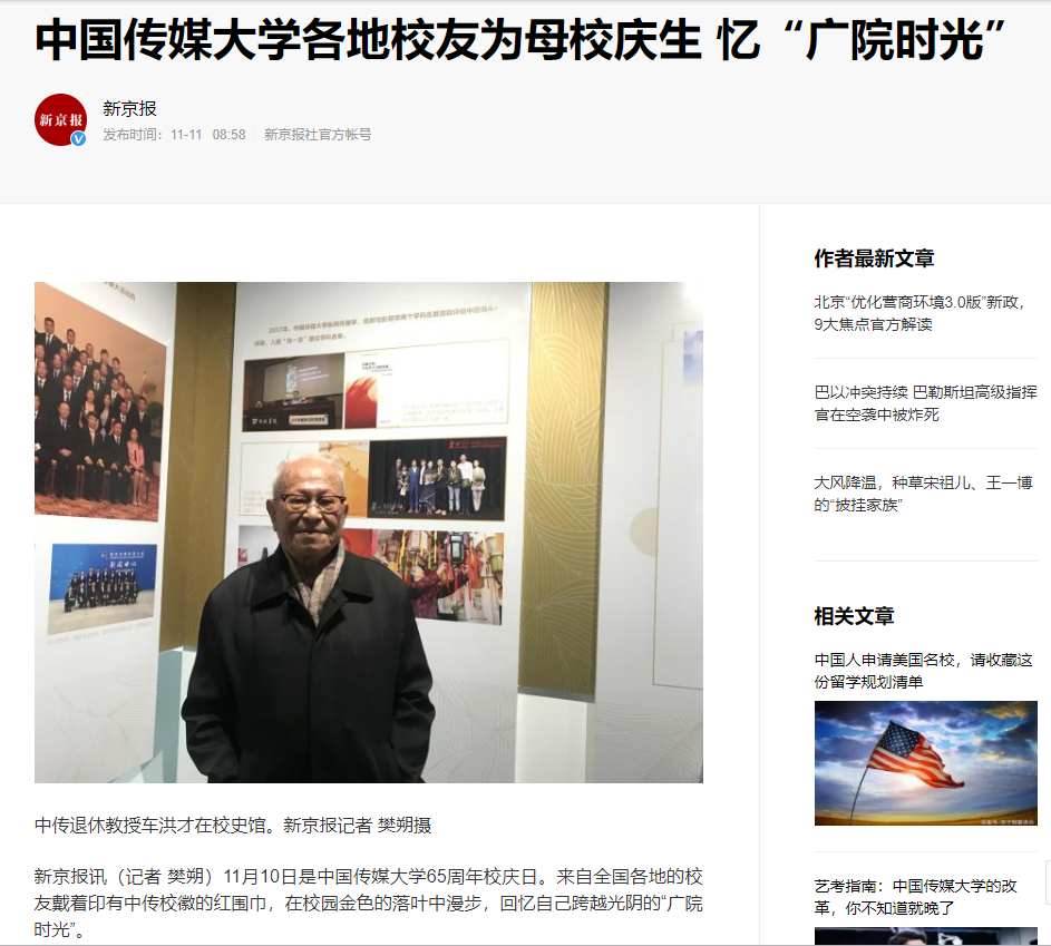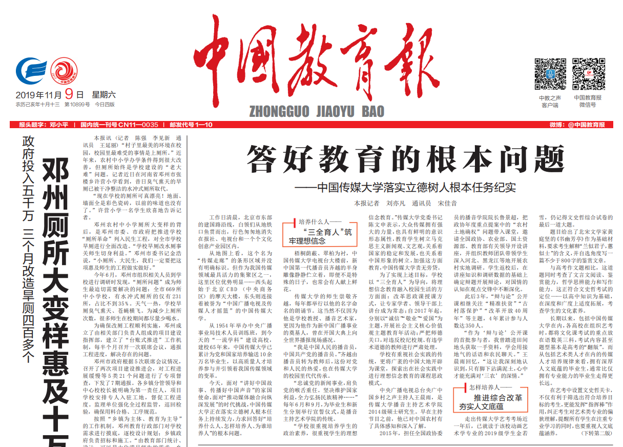 11月9日,《中国教育报》在头版头条刊发文章《答好教育的根本问题——中国传媒大学落实立德树人根本任务纪实》,系统介绍了中国传媒大学对于“培养什么样的人,怎样培养人,为谁培养人”这一根本性、时代性命题的回答。廖祥忠校长在校友座谈会上就人才培养、学科建设、体制机制改革、通识教育等方面擘画的系统办学理念,也被各大媒体纷纷报道,产生了很大的社会影响力。时至今日,社会媒体对中传65周年校庆的报道仍在持续。11月18日,中央电视台音乐频道在《音乐周刊》节目中进行了专门报道。