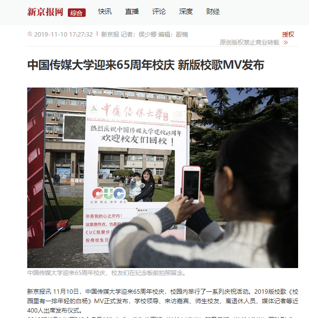 今年是新中国成立70周年华诞,中国传媒大学也迎来了建校65周年的喜庆日子。从6月开始,学校官方网站白杨网、校报、电视台、官方微信、官方微博等媒体围绕校庆开展集中宣传,通过文字、图片、视频、直播等多种形式全方位报道校庆活动,有力地营造了喜庆热烈的氛围。