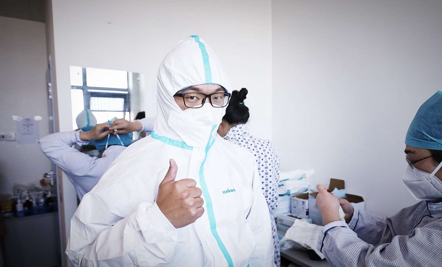 摄影师穿戴好防护装备准备进入ICU拍摄
