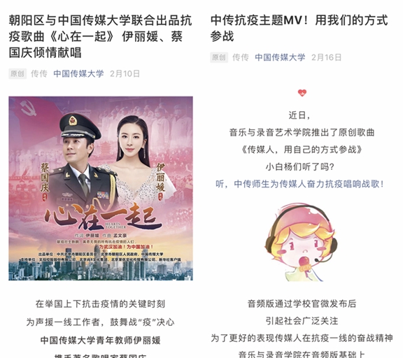 在做好疫情防控的同时,广大师生积极发挥自身特长,通过文艺创作、专家指导、志愿服务、捐款捐物等多种方式,以传媒人特有的方式,支持全社会防疫抗疫工作。师生创作的《传媒人用自己的方式参战》《心在一起》等文艺作品,在全国各大媒体平台播放,赢得了广泛好评。
