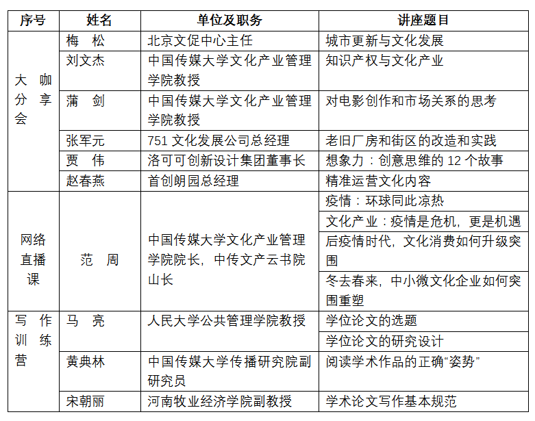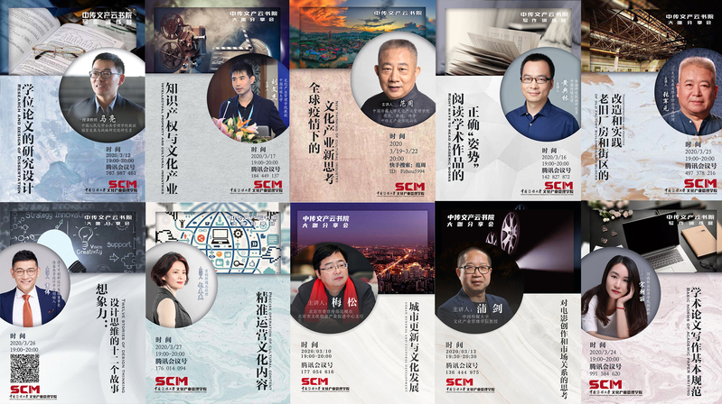 (通讯员 杨剑飞)作为全国首家以“文化产业”为名的网络书院,中传文产云书院为期三周的公益系列讲座于3月27日顺利结束。本次活动共分为“大咖分享会” “网络直播课”“写作训练营”等三个单元,从3月10日起,先后邀请了来自于北京市文促中心、中国人民大学、中国传媒大学、洛可可集团、751文化发展公司、首创集团、河南牧业经济学院等10位文创专家学者进行网络分享,讲座主题覆盖城市更新、电影创作、知识产权、疫情下的文化产业、文化产业园区运营、创意思维、论文写作等多个方面,受到听众的高度好评,尤其是网络直播课单元,连播四晚的收看量达到了376万人次。