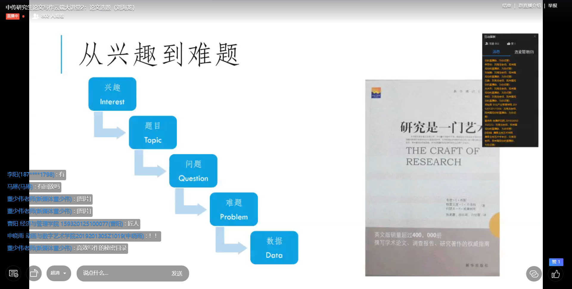 刘海龙教授从“为什么要读你的论文”、“为什么选题被否定”两个问题讲起,进而结合大量案例深入浅出地讲解如何进行学位论文的选题、选题如何做到创新独特,并逐一列举学位论文选题的常见问题、写作规范与常见问题。最后与同学们分享如何阅读学术文献、如何寻找相关文献、如何记学术笔记,等等。