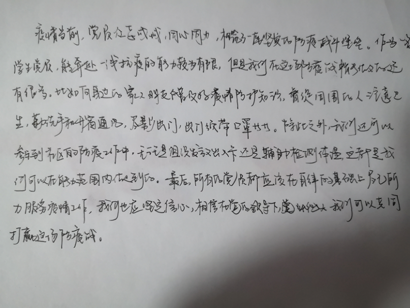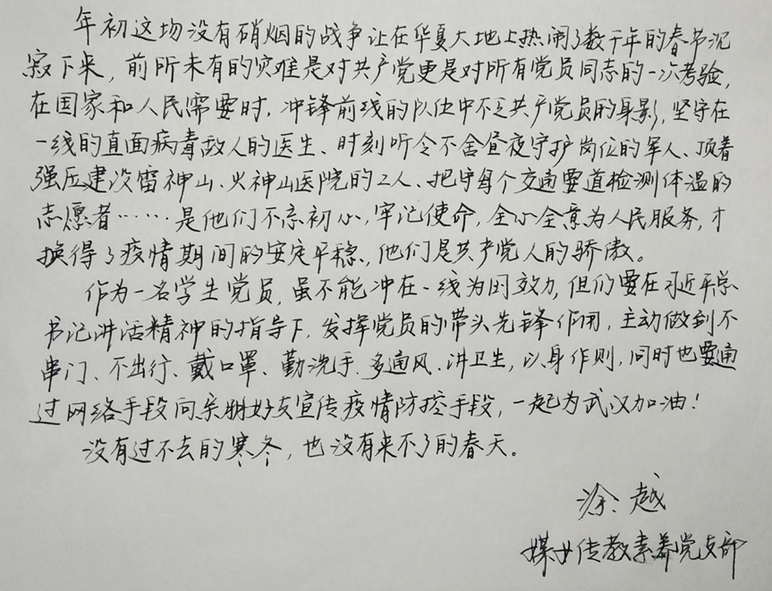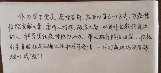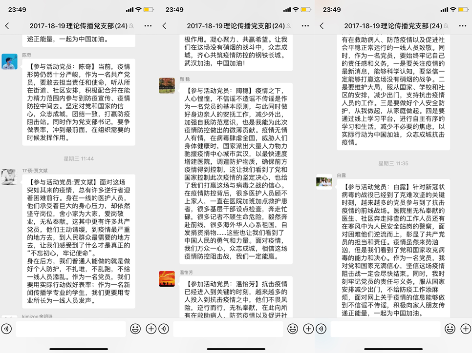 疫情期间,大家虽身居各地,却通过各种形式发挥着党员的先锋模范带头作用。理论传播与传播史党支部带领党员通过线上微信群为防疫一线工作人员加油打气,同时也给居家隔离的学生党员们加油。此外,还有很多支部党员通过手写感想来表达自己的决心与信心。