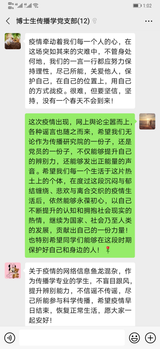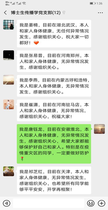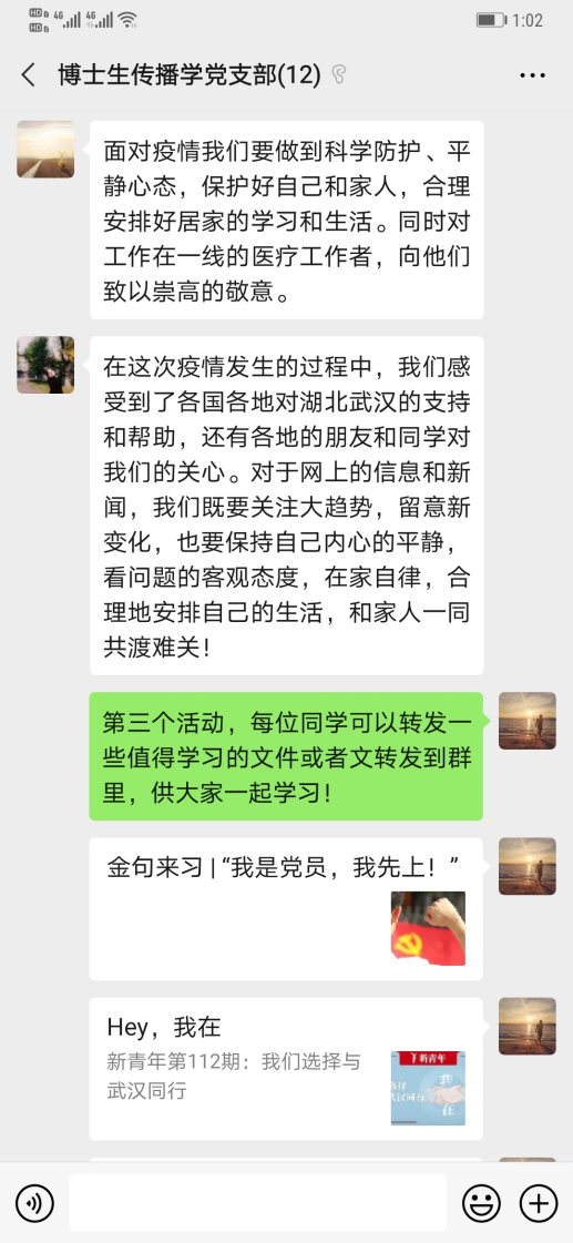 传播学博士党支部的主题党日活动由“报平安、送祝福”“疏导情绪、提振士气”“学讲话、树信心”“用语音为武汉加油”四部分组成。通过线上交流,党员同志们充分感受到了学院对于学生安全工作的重视。这样的线上活动形式,给身处各地的党员同志们所带来的温暖与祝福,也充分体现了党组织对党员同志们的关心与爱护。
