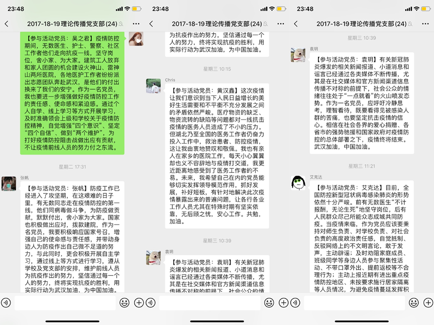 该支部中的三名湖北籍党员同志通过文字表达了对抗击疫情的切身感受。身处湖北武汉的姜楠动容地写道:“在这次疫情期间,我们感受到了全国各地对湖北武汉的支持和帮助,还有各地的朋友和同学对我们的关心。对于网络上的信息和新闻,我们既要关注大趋势,留意新变化,也要保持自己内心的平静。”