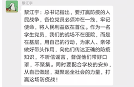 媒介与女性方向研究生丁靓琦同学表示:“我们作为新闻传播学科出身的学子,这个时候就应该积极地为家人朋友传递准确、全面的信息,并开导大家保持积极的心态。”媒介素养方向杨丽同学亦表示:“党员同志要带头积极配合各项工作,坚定必胜的信心,同时引导周围群众正确认识疫情,助力国家防控工作及时有效的开展。”