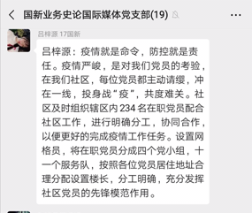 在国际新闻业务、史论、国际媒体党支部的主题活动中,在抗“疫”一线做志愿者工作的吕梓源同学通过微信文字表示:“疫情就是命令,防控就是责任。疫情严峻,是对我们党员的考验。在我们社区,每位党员都是主动请缨,冲在一线,投身战‘疫’,共度难关。”同时,她也很详细地介绍了社区抗“疫”的工作分工。