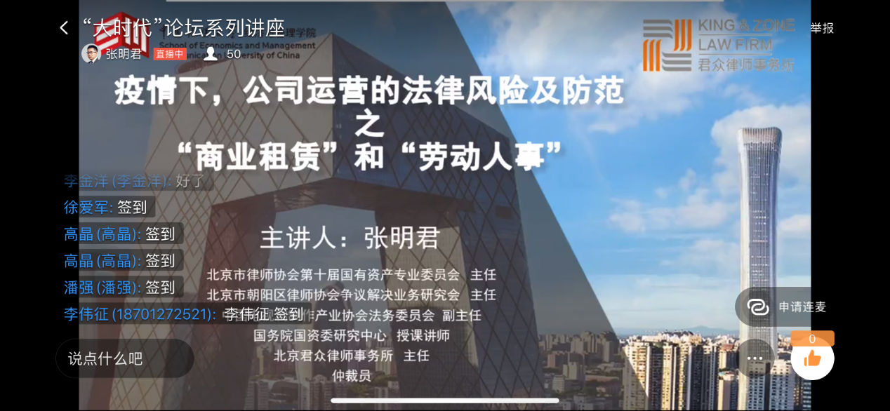 张明君律师首先从承租人的角度分析了商业租赁,还从劳动者的角度分析内部用工(包括企业如何支付疫情期间的工资、企业复工复产后面临的劳动保护)等问题,并给出法律建议。此外,张明君律师也对“停工停产第一个工资周期如何计算?不能返岗员工,可否解除劳动合同?延迟复工期间,劳动合同和试用期到期如何处理?延迟复工期间,单位解除劳动合同,如何补偿或赔偿?”等问题一一进行了解答。张律师深入浅出,结合社会时下案例进行全面细致的分析,并从专业法律角度,为企业和劳动者出谋划策,赢得了大家的一致好评。
