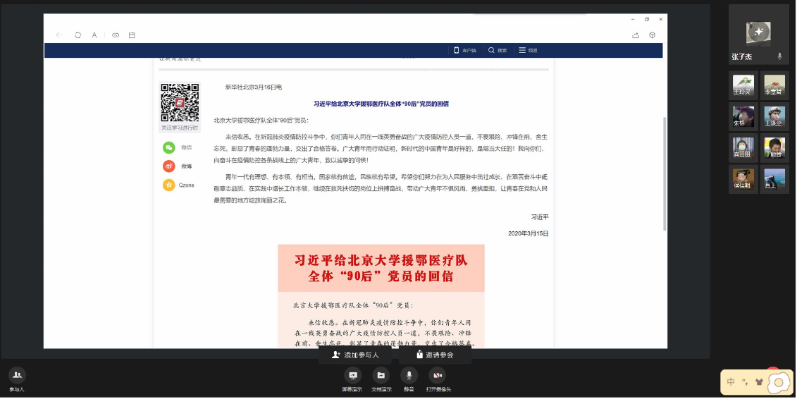 通过学习,同学们深切地感受到,习总书记给北京大学援鄂医疗队全体“90后”党员的回信,饱含着党和国家对青年党员的关切与赞扬。大家纷纷表示,要将学习成果转化为扎实行动,严格遵守疫情防控期间“不离家、不返校”的要求和各项规定,结合自身实际制定学业计划,做好线上学习;创作优秀艺术作品,唱响主旋律。用行动展现新时代青年的责任担当。