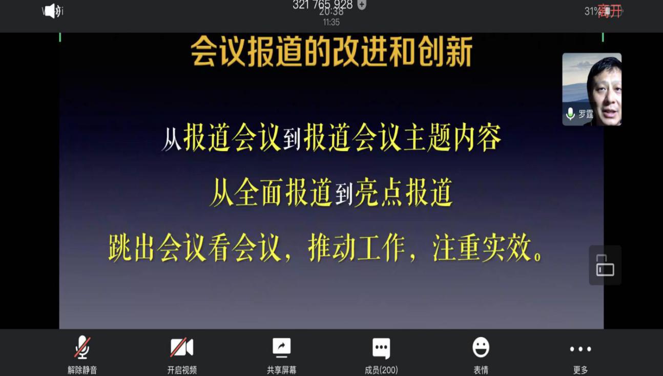 首次培训于2020年5月18日晚7点开始,由我校培训学院副院长、政府与公共事务学院副教授罗霆老师进行两个小时的在线授课,课程主题为《守正创新,敢做善成——融媒体新闻策划实务》。课程通过腾讯会议室线上直播,参与人数200余人。