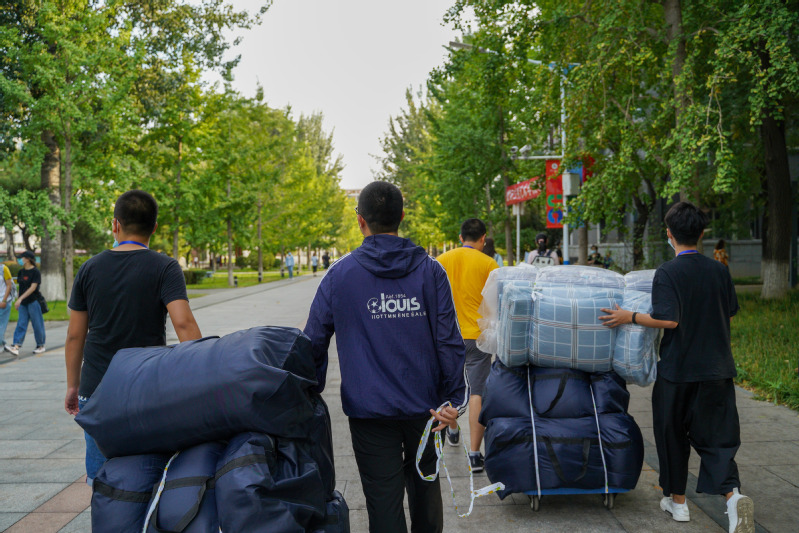 在“绿色通道”现场,来自中国传媒大学的学生资助志愿服务总队的师生热情帮助新生完成“绿色通道”线下流程。他们每天早上六点五十就开始忙碌在“绿色通道”迎新处,为新生解答各种资助问题、校园生活问题,为新生领路指引。在领取爱心被褥时,部分居住在梆子井公寓的女同学反馈被褥太沉,很难自己搬运回宿舍。志愿服务总队的男生自告奋勇,用小板车拉着被褥穿过校园、穿过天桥,不辞辛劳,汗水湿透了他们的衣衫。他们用自身的行动让每一位办理绿色通过的新生感受到了学校如家般的温暖与关爱。