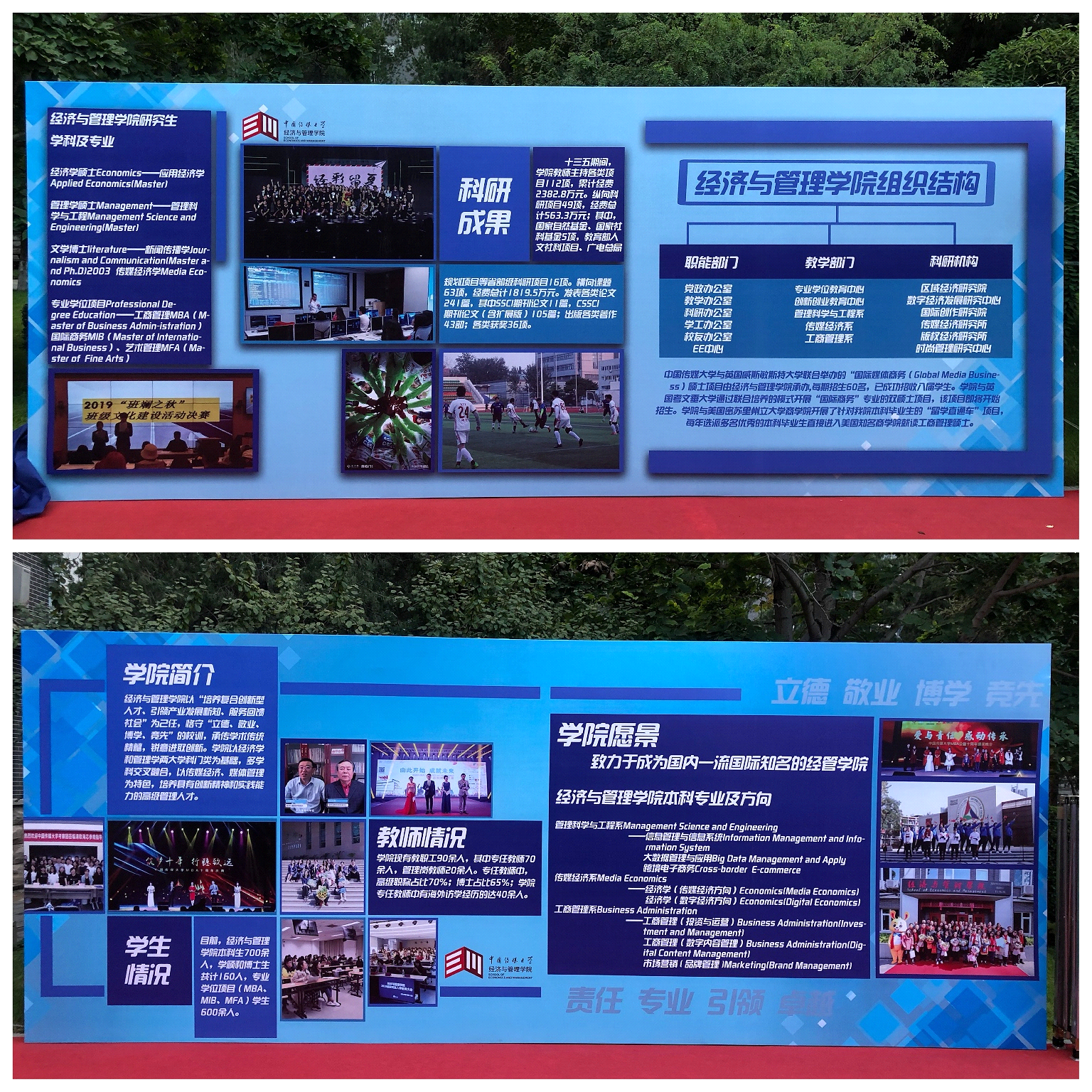 “一意”是指学院在报到过程中以丰富的形式培养学生立志高远、奋斗追梦的意识。学院设计三块分别针对本科、MBA以及学术硕博的“励言墙”,“为今天的努力喝彩,为明天的辉煌拼搏”、“今日传媒莘莘学子,明日商界超凡精英”、“新起点、高目标,迈向新的成功”等标语鼓舞新生在入学时树立目标,专注目标,实现目标。同时设置学院介绍喷绘,方便新生从学院概况、师生情况、学科专业、科研成果、组织架构、学生活动等方面整体了解学院情况。