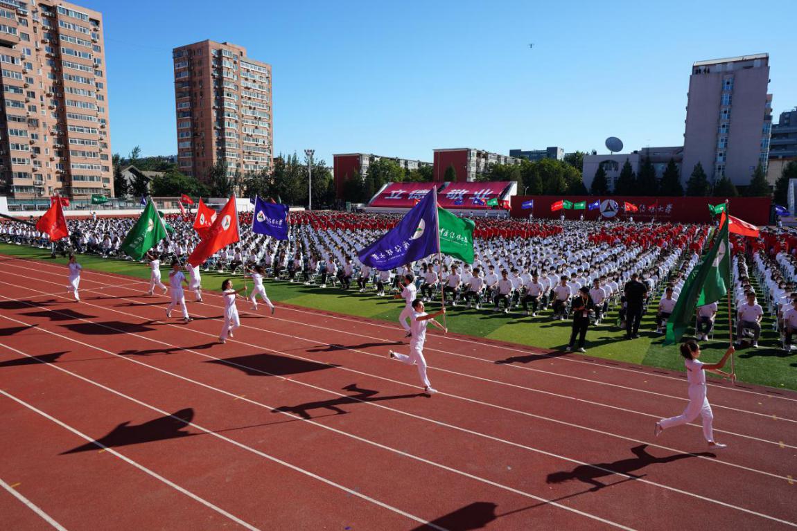 宽阔的体育场装扮一新,洋溢着浓浓的喜庆气氛。体育场中间,新生同学身穿红白两色校园文化衫,组成“中传♥你”的巨幅醒目图案,传达出学校对新生的热烈欢迎与深切关怀;主席台正上方悬挂着“中国传媒大学2020级新生开学典礼”长条横幅,左右两边矗立着两块巨型屏幕,用以播放学校为新生同学精心制作的节目和典礼直播盛况;体育场东侧看台上装饰的“立德、敬业、博学、竞先”八字校训,告诫新生同学要时刻牢记校训,努力成为一个合格的传媒大学学生。