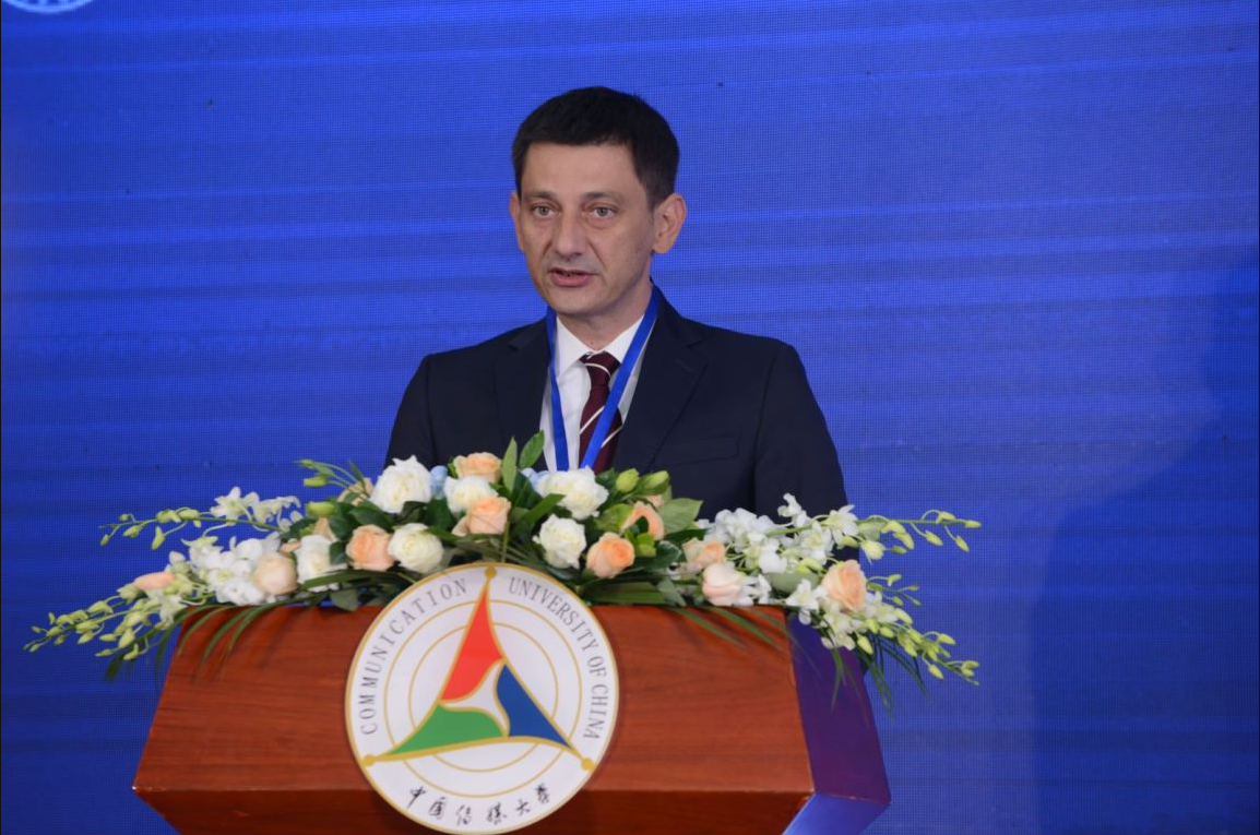 中华人民共和国外交部国际问题研究院副院长刘卿在致辞中首先祝贺中国传媒大学人类命运共同体海外研究中心和人类命运共同体国际学术联盟的成立,并从“人类命运共同体”理念的提出到发展谈起,认为经济下行、恐怖主义、气候变化、流行疾病等全球威胁仍然存在,人类生活在一个共同体中,面临许多共同的挑战。人类命运共同体研究院应积极开展全球治理研究工作,希望中心和联盟能发挥优势,为我们带来更多的解决方案。