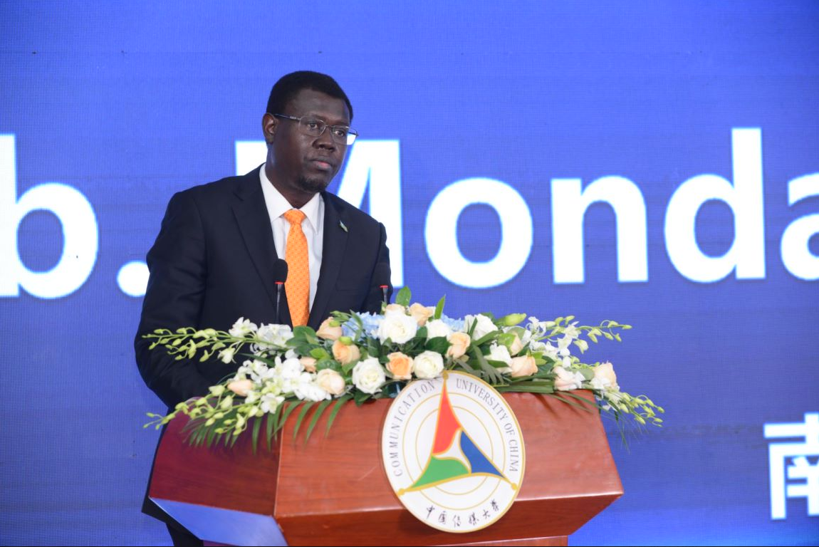 南苏丹共和国驻中华人民共和国大使馆临时代办昆巴·蒙代在致辞中希望继续推动和中国的双边关系,同时也加强和中国传媒大学的合作。