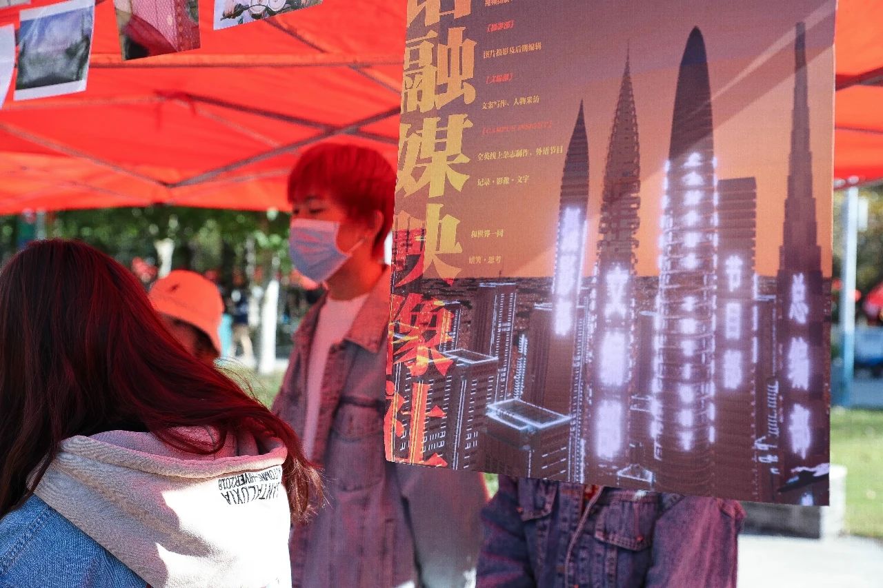 多语融媒映像社以社团自制影片吸引来往的人流,精彩的活动照片和多重专业技能吸引大家争先扫码加入招新群聊。