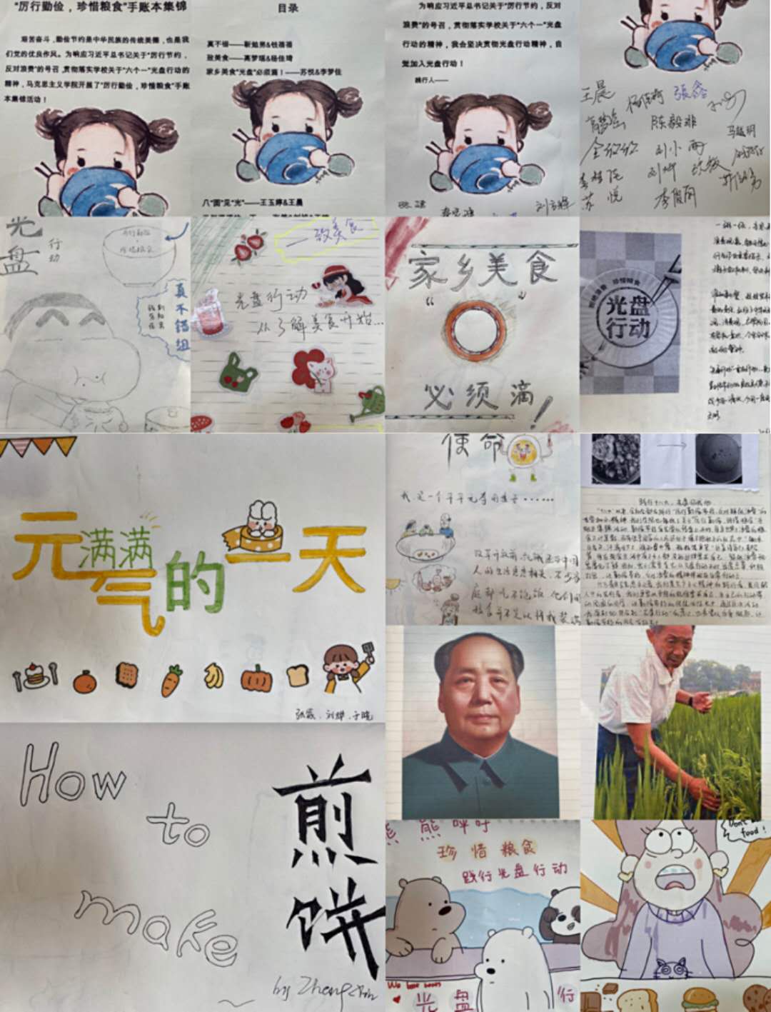 活动中,同学们踊跃创新、积极动手,绘制了主题鲜明、内容丰富、形式多样的手账。其中马越玥、李俊丽小组将粮食从播种到收获的全过程展现得淋漓尽致,潜移默化地增强同学们节约粮食的意识;刘方辉、马楚博、秦家珅小组从一个盘子不同时期的使命出发,生动形象地呼吁大家积极参与光盘行动;张筱、于晓小组则以元气满满的一天为主题,点明“吃多吃少,光盘正好”;王玉婷、王晨小组介绍了家乡的八种面食,让人在惊异于中华民族饮食文化博大精深的同时,理解尊重食物就是尊重文化。活动以小组形式完成,共有九个小组参与,各组将符合主题的作品内容呈现在分发的卡纸中,最终作品均装订成册。