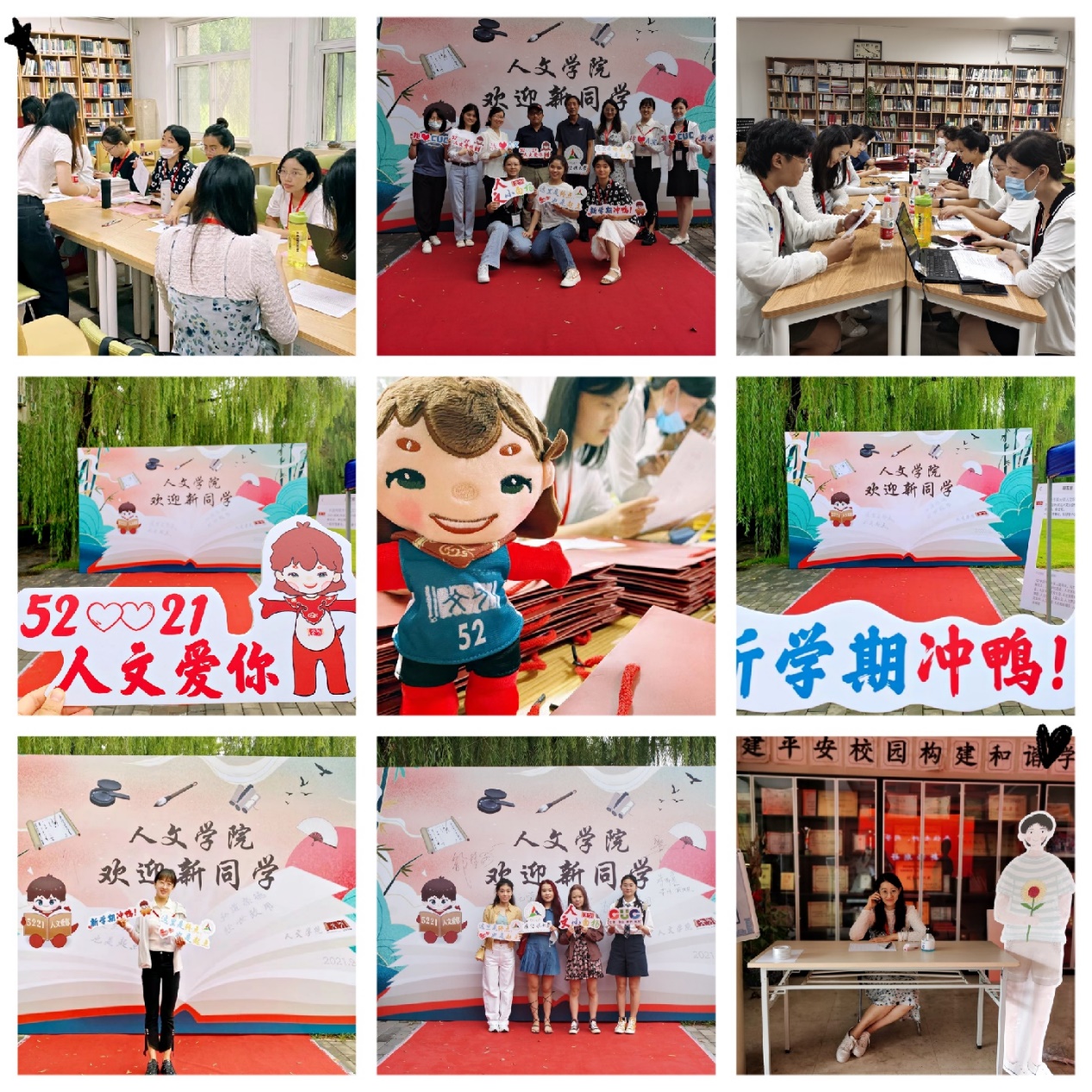 在此次迎新工作中,学院专门设计了独具特色的喷绘、kt手牌、合影留念展板,以及吉祥物“文文”玩偶。“文文”的设计借鉴了文字创造者仓颉的形象,希望人文学子能善观天地,俯察万物,百工以远,万品以察,将中国传统文化发扬光大。每一位新生都能领到一份纪念品礼包,其中包含“文文”玩偶、学士服、篮球队队服和“柿柿如意”联名款T恤套装。kt手牌则设计了“人文爱你”“新学期冲鸭”“这里是终点,也是起点”“弘道崇德,经世致用”等话语,表达着对新生的殷切期望。新生们在签名板写下自己的名字,手持特色kt手牌、学院玩偶在展板前留下入校第一帧画面,定格与学院的初遇。