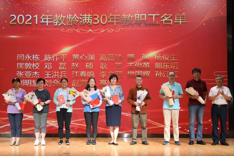 庆祝表彰会后,校领导与教龄满30年教职工、获奖代表在国重大楼前合影留念。