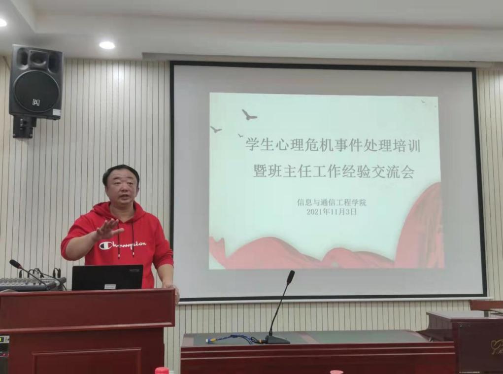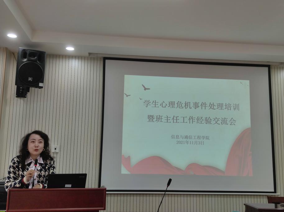 (通讯员 梁晶晶 赵予舒 摄影 赵予舒)为加强班主任队伍建设,提升学工队伍识别和应对学生心理危机能力,11月3日下午,信息与通信工程学院举办学生心理危机处理培训暨班主任工作经验交流会,学院党委书记李增瑞及全体班主任、辅导员参加。学校学生心理健康教育中心主任张静作了学生心理危机处理专题培训,近两年获得校级“中央广播电视总台优秀班主任”的三位老师现场分享工作经验。交流会由学院党委副书记钟丹丹主持。