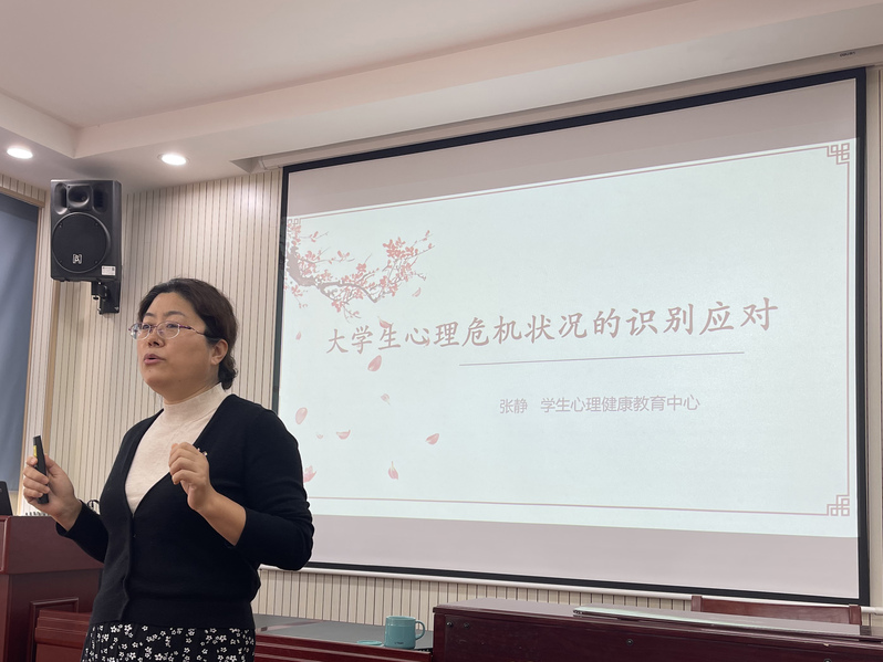 张静主任用详实的数据向大家通报了信通学院近年来的学生心理状况,并结合真实案例分析影响学生心理健康状况的主要因素和心理危机的严重后果。她同时向大家介绍心理危机干预原则。