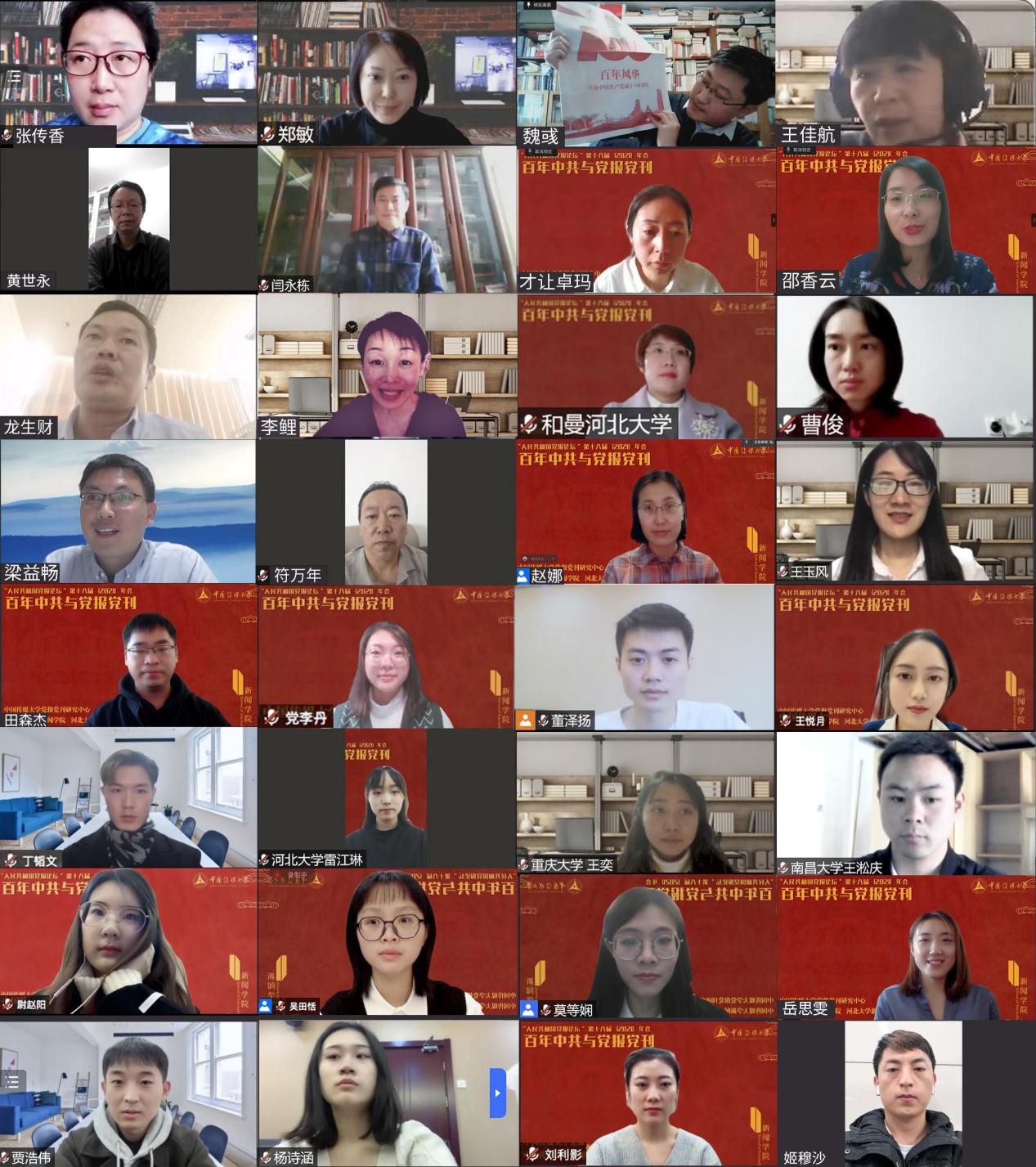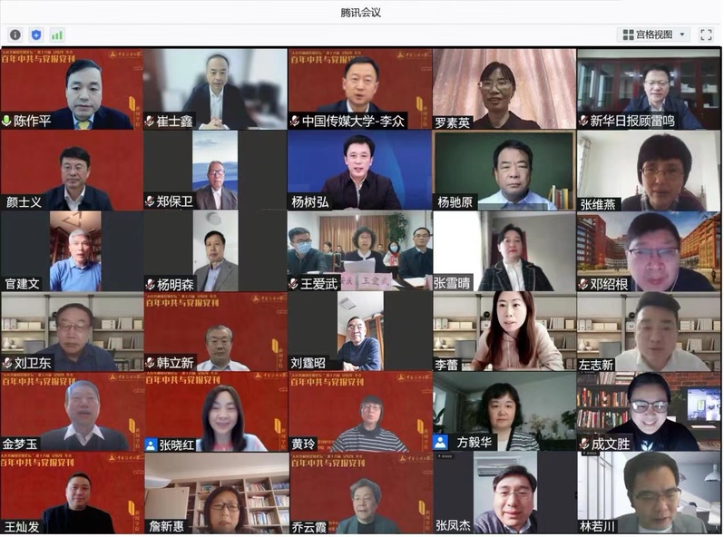 本届年会由中国传媒大学党报党刊研究中心、中国传媒大学新闻学院与河北大学新闻传播学院联合主办。来自人民日报社、求是杂志社、新华日报社、北京日报社、重庆市委当代党员杂志社、传媒杂志社、新华社《中国记者》杂志等19家中央及地方党报党刊主流媒体,中国传媒大学、中国人民大学、河北大学、广西大学、天津师范大学、南开大学等16所高校、科研机构以及安徽省安庆市委宣传部的嘉宾,相聚腾讯会议云端,围绕中共百年党报党刊发展、党的新闻理论与新闻思想、新时代党报党刊的创新实践以及媒体深度融合发展等议题展开交流研讨。与会代表共计80余人。