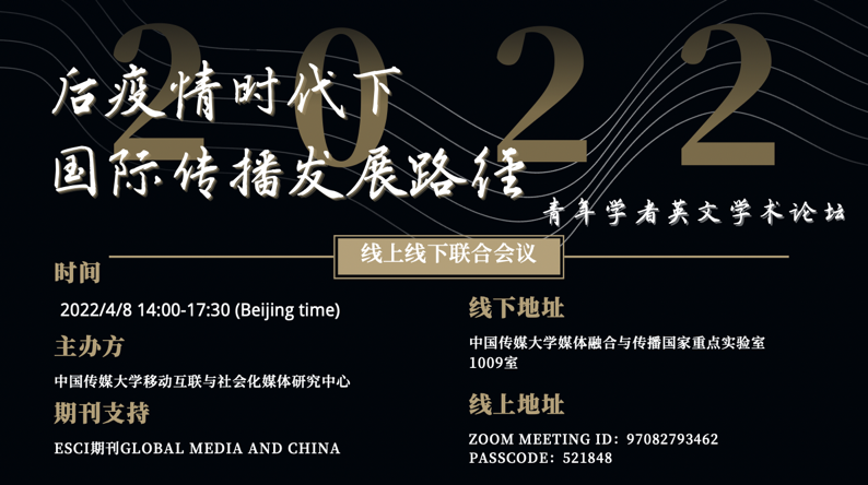 (通讯员 韩霄)4月8日,由中国传媒大学移动互联与社会化媒体研究中心与ESCI英文期刊Global Media and China(《全球媒体与中国》)编辑部共同承办的“后疫情时代下国际传播发展路径”英文学术论坛顺利举行。