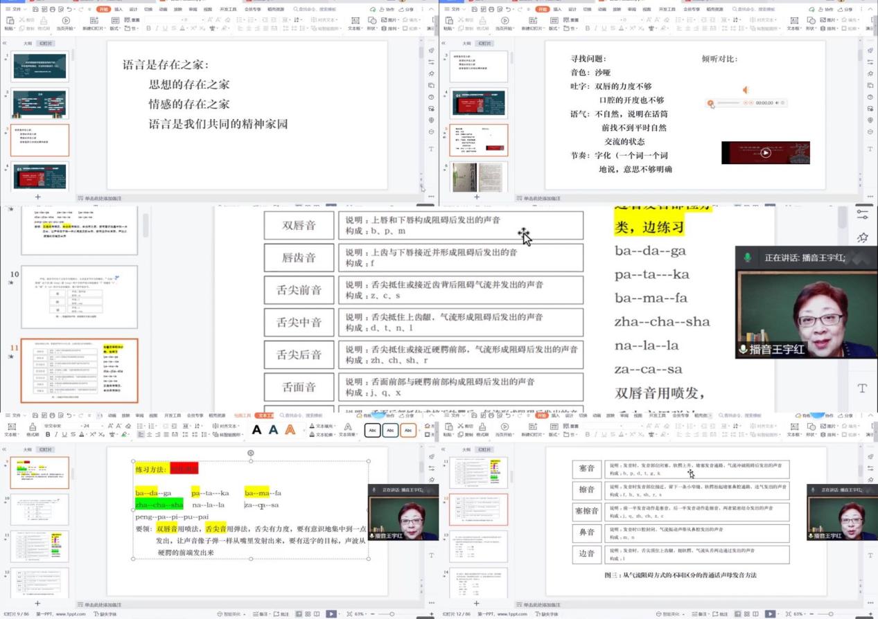 王宇红副教授围绕“音色、吐字、语气、节奏”从六个方面进行了细致、生动的详细讲解和训练实操。她带着老师们深入分析了在“科学发声、吐字归音”等方面的声音问题,通过倾听对比音频作品与老师们的作品,讲述发音分类理论知识,还邀请老师们练习普通话声母发音,在练习中教会老师们如何利用发音部位正确科学的发声。