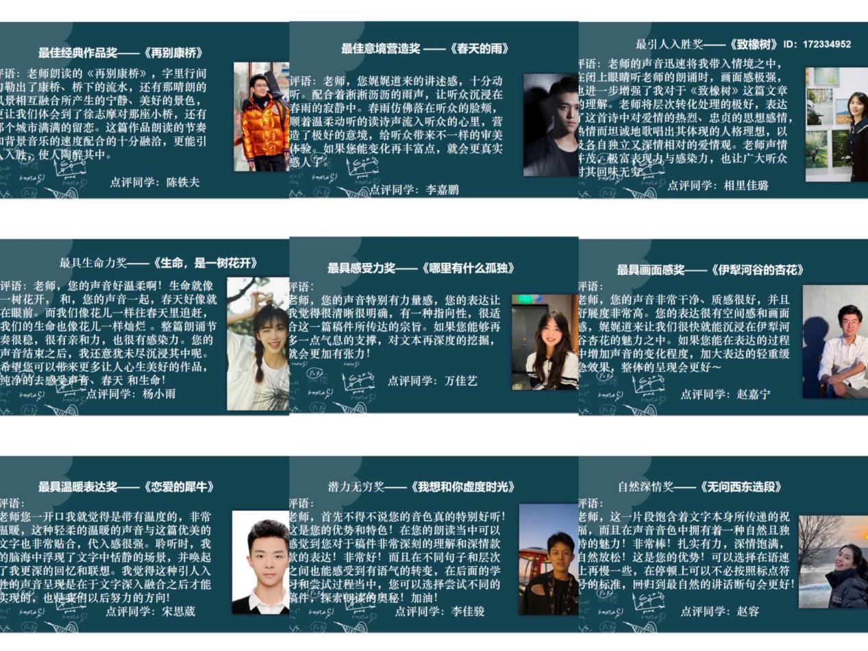 王宇红副教授还就教师们提交的朗诵作品进行了点评指导,指出良好的课堂语言需要做到“字美情真、声情并茂”,并给出了课堂教学语言优化的专业建议。最后,王宇红副教授还邀请播音主持艺术学院的学生对老师们提交的作品进行了颁奖和点评,以表学生们对老师们的期盼和赞许。