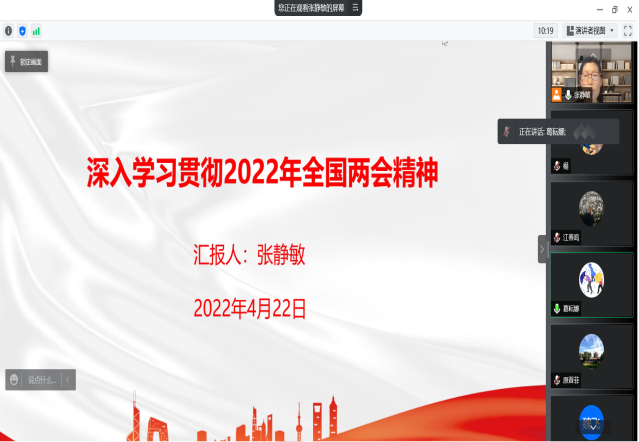 马克思主义理论教工党支部于4月22日晚开展了“2022两会精神”线上专题党课学习活动。支部书记张静敏主持会议,并作为领学讲授了本次党课。
