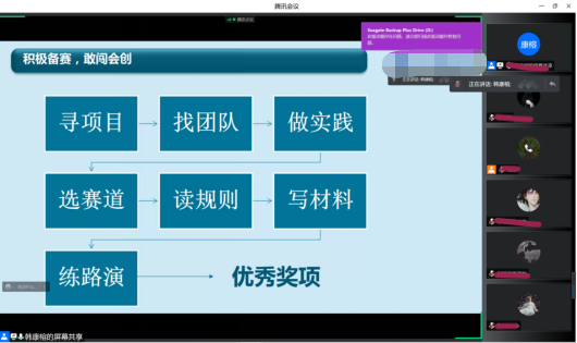 关于如何备赛,韩老师认为重点在于7个步骤。第一步是寻项目,好的项目可以来源于科研成果的转化,也可以来源于过去已有的项目,甚至是开展时间较久效果较好的社会实践项目或社团活动等;第二步是找团队,项目团队不只是参赛学生团队,还有导师团队,学生可以来自于不同专业,导师也可以来自高校和企业,这样既能获得学术上的指导,又能有商业上的帮助;第三步是做实践,一个好的项目一定是能实践落地的,而非仅仅纸上谈兵;第四步是选赛道,商业性强的走主赛道,公益性强的走红旅赛道,而产业命题赛道则是针对特定的产业;第五步是读规则,根据规则来优化各部分的内容;第六步是写材料,校赛、市赛和国赛有不同的要求,必要的时候可以寻找相关专业的同学并肩准备;第七步是练路演,最好在完全不了解项目的人面前进行演练,通过对方的反应和看法做出改进。