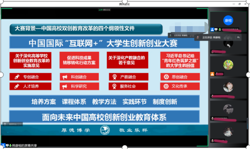 (通讯员 曹若琪)4月28日下午,中国传媒大学创新创业训练营系列讲座第一期顺利举办,此次讲座采用线上直播的方式,特邀北京邮电大学叶培大创新创业学院基地主任韩康榕老师主讲,主题为“中国国际‘互联网+’大学生创新创业大赛解析与备赛”。200余名学生线上参加了讲座。