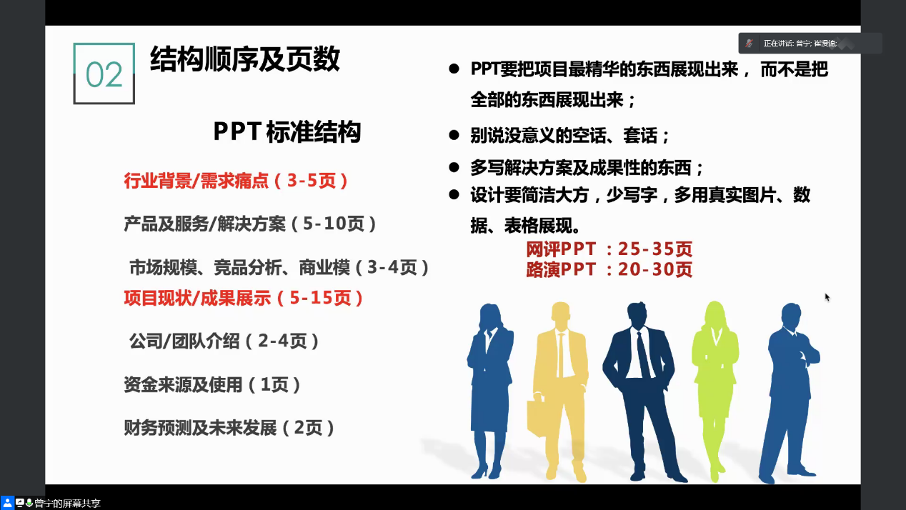 曾老师从PPT的封面、行业背景、技术、产品、市场规模、商业模式等二十多个板块详尽、完整地介绍了路演PPT应包含的内容,建议同学们通过这些板块明确路演过程的讲述逻辑,同时有效应对专家提问。