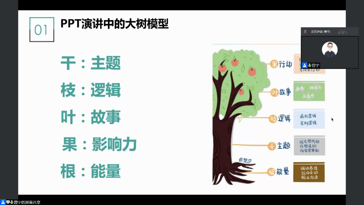 曾老师回顾了近几年“互联网+”大赛的相关历程,并分别从主赛道、红旅赛道等不同赛道分析了本届大赛的不同之处。曾老师以大树作比,直观、生动地将路演PPT的主干结构展示给大家,强调高质量路演PPT的关键是要将项目的精华呈现出来,并在极短时间内提炼出项目核心点。