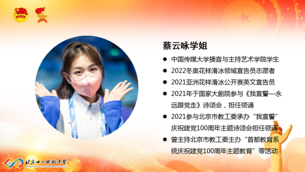 在宣讲环节中,我校两位同学分别从冬奥志愿服务和校园志愿服务的角度,结合自身实践学习经历,向十一实验中学的学子们生动诠释了什么是“奋斗的青春最美丽”,激励少先队员们把个人梦想融入时代潮流中,追求卓越、奉献青春,用诚实、勤奋、向上的心态勇敢面对未来。