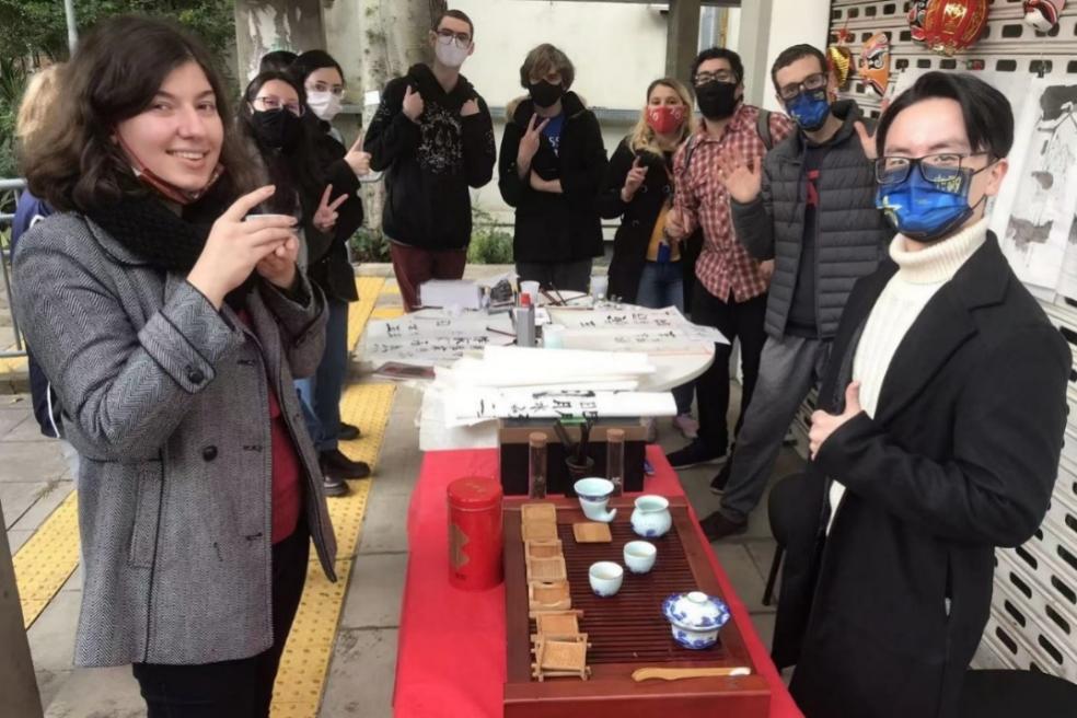 孔子学院学生和参观者一起品茗赏茶