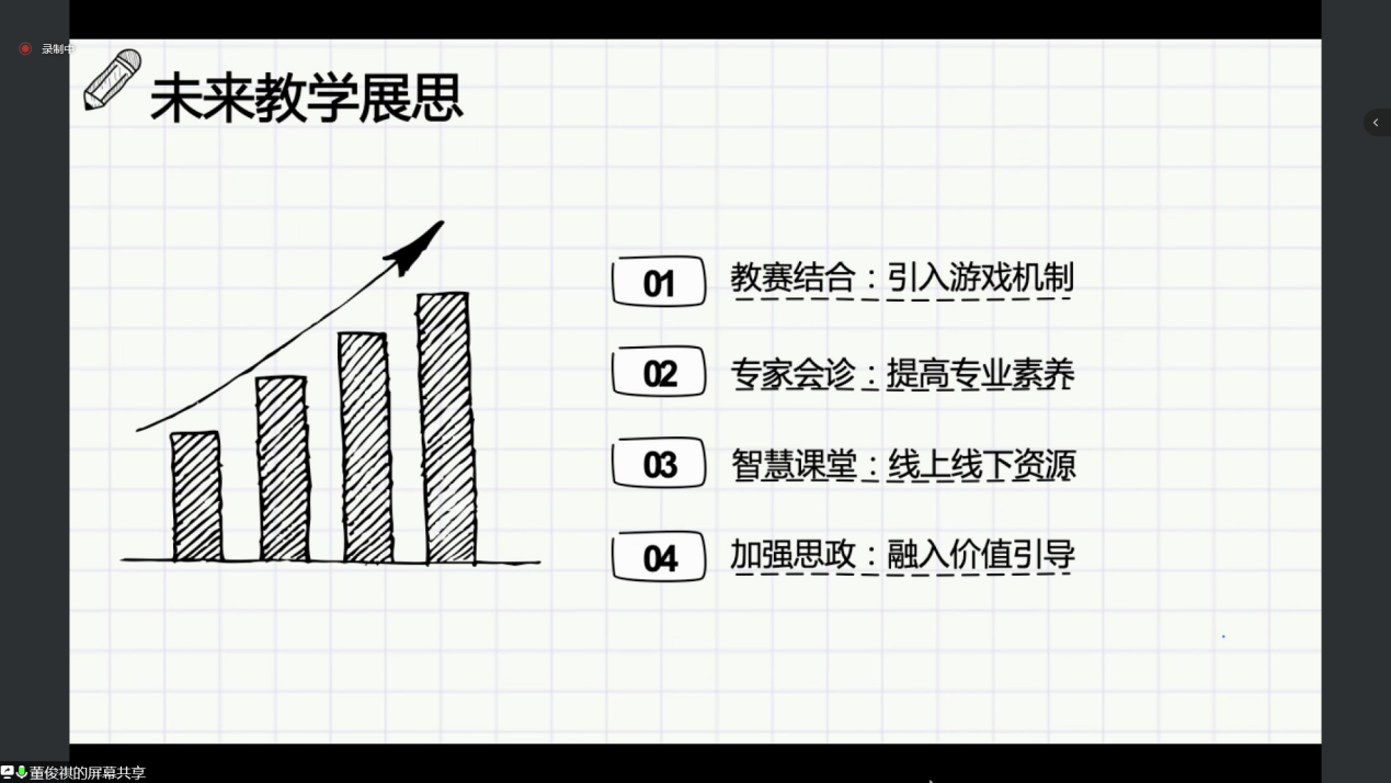 讲座最后,董俊祺老师对未来教学设计进行了展望,进一步提出教赛结合、专家会诊、智慧课堂、加强思政四大方面的思考,为老师们提供了新思路和新视野。