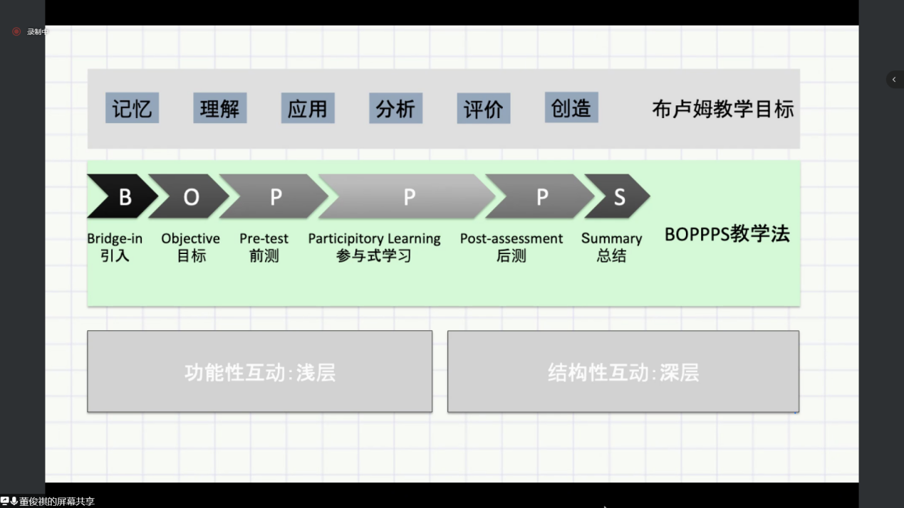 董老师以她所讲授的《传播学概论》和《广告文案》两类课程为例,具体阐述了在线上、线下课堂中,学生在认知层面、技能层面、价值层面等方面遇到的问题。从浅层的功能型互动出发,董老师分享了“BOPPPS教学法”,强调在形式、程序、内容上进行有效提问,以桌游模式、剧本演绎、拼贴练习等方法为依托,进一步解决讲授流程、程序设计、教学方法等方面出现的课堂问题。从深层的结构型互动出发,董老师分享了“布卢姆教学目标分类”,强调在思路上理解教学目标、在路径上有效组织资料,进一步解决教学目标、课程体系、内容设计等方面的课堂问题。通过功能型互动和结构型互动两者的深入结合,董老师详细演绎了课堂互动的理论技巧和实践经验,从而进一步提高老师们进行课堂互动的理论能力与实践水平。