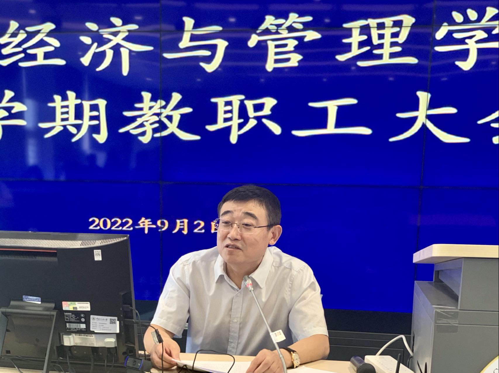(通讯员:韩芮莎)2022年9月2日,经济与管理学院2022年秋季学期教职工大会在33号楼阶梯教室召开,大会传达学习我校秋季工作会议精神,经济与管理学院党委书记王晓丽主持大会。