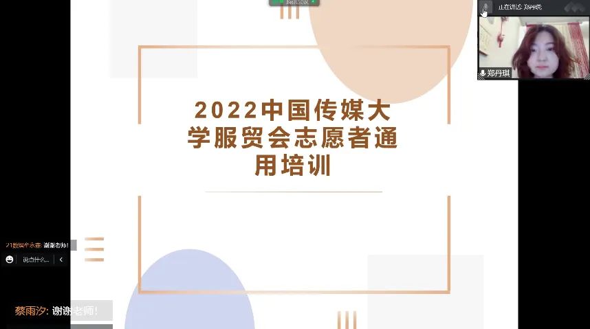8月25日,服贸会志愿者迎来了他们的培训第一课——开班动员会。会上,校团委书记郑丹琪出席了本次会议,并对本次服贸会志愿纪律和疫情防控等方面作出了重点强调,对志愿者参与服贸会期间的表现寄予厚望,展现出新时代传媒青年的风采。